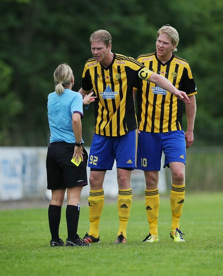Bröderna, Martin och Mattias Viggeborn i samspråk med domaren i derbymatchen mot Sävedalen tidigare i sommar.