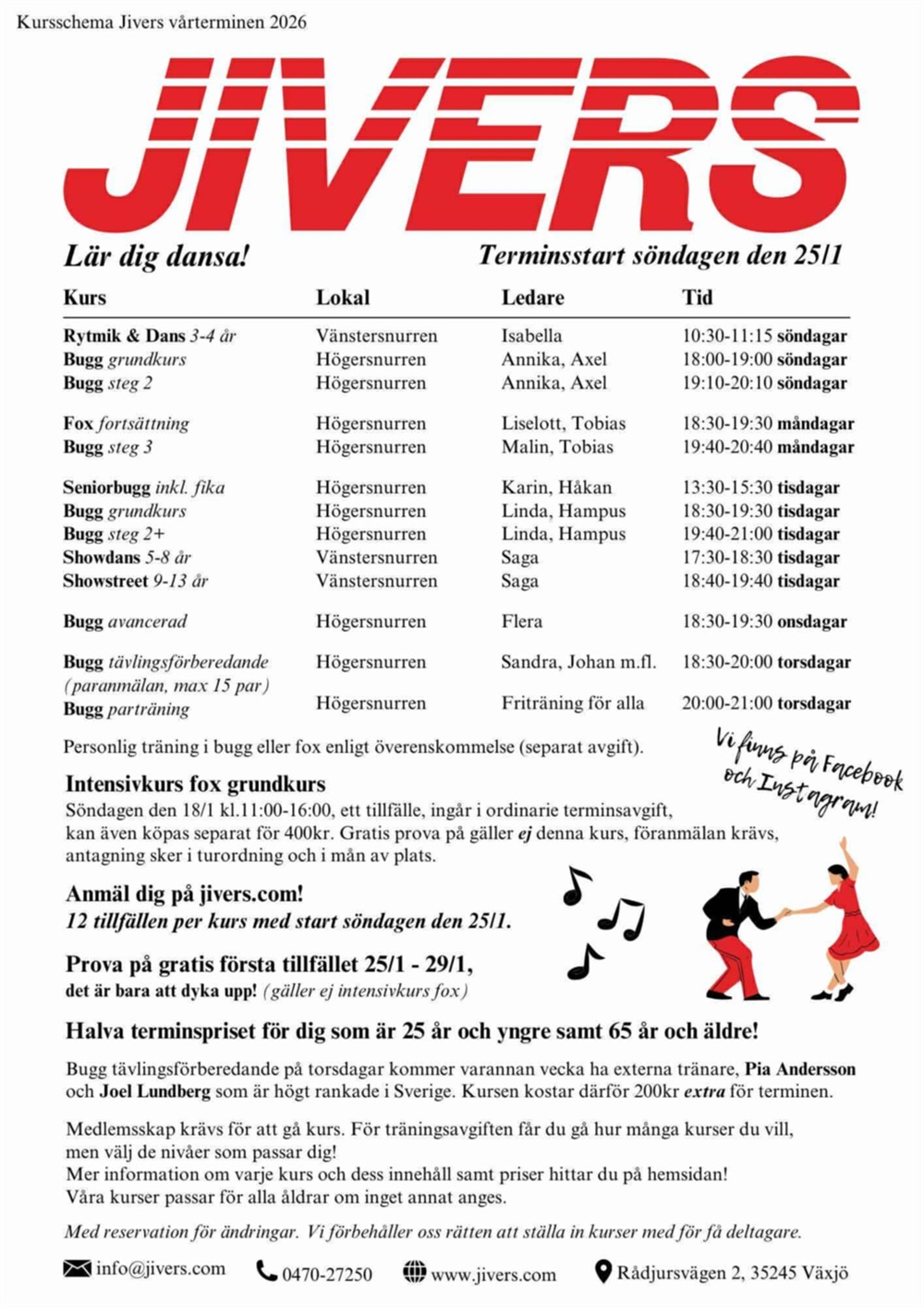 Tillsammans med våra duktiga kursledare utvecklas vi och ta lärdom av varandra. På Jivers känner du en gemenskap som gör att du vågar utmana dig själv och på så sätt utveckla din dans.