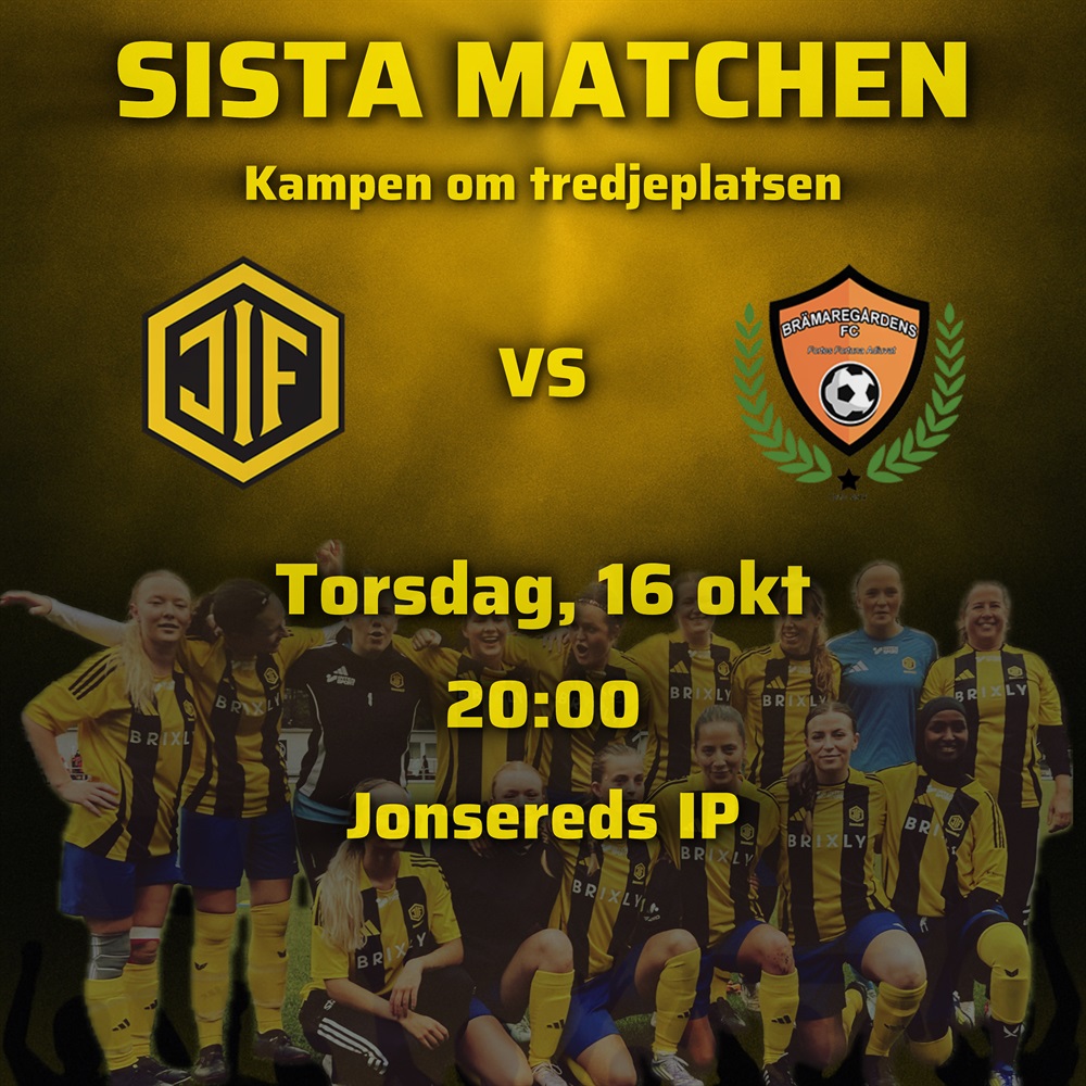 Imorgon, torsdag, spelar vi säsongens sista seriematch — hemma på Jonsereds IP mot Brämaregårdens FC.