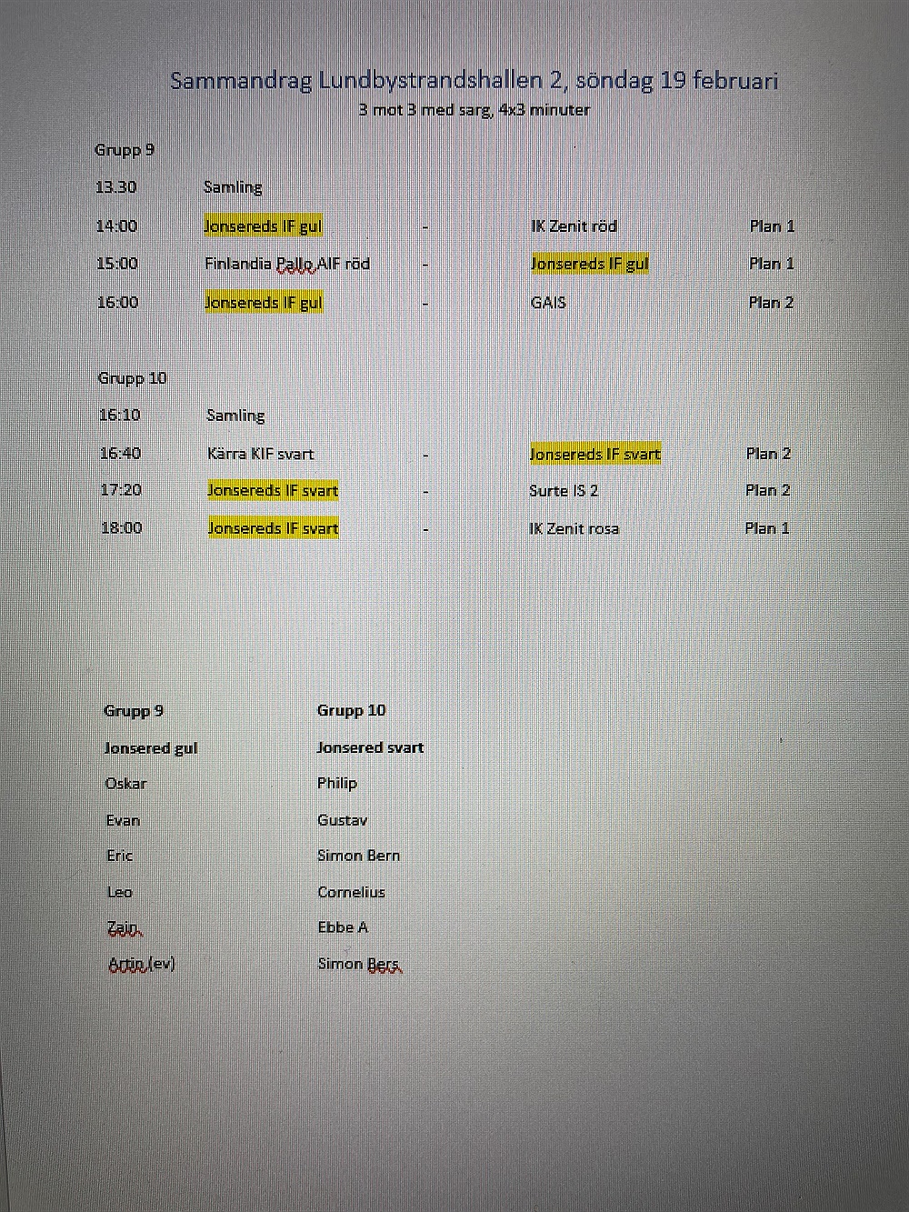 Här kommer uppställningen och tider för sammandraget på söndag.