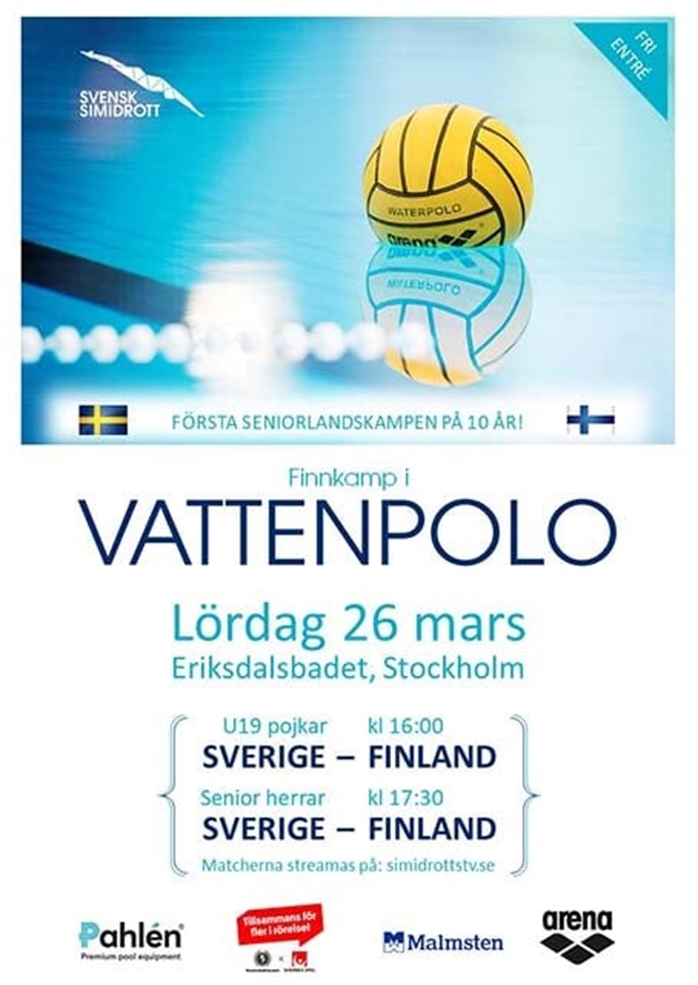 Kom till Eriksdalsbadet på lördag och kolla när Sveriges herrlandslag spelar! Finland står för motståndet i Sveriges herrlandslags första landskamp på 10 år.