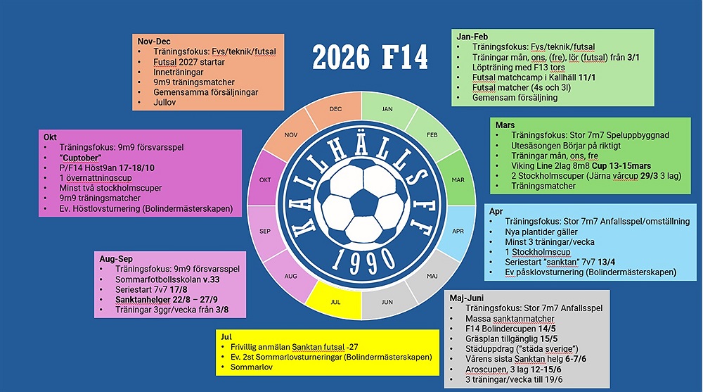 I planen för 2026 ingår även minst två övernattningscuper, minst 3 träningar/vecka, 3+ lag på 3 nivåer i sanktan, fortsatt gott samarbete runt matcher med F13 och F15, futsalmatcher, stockholmscuper och massa annat kul.