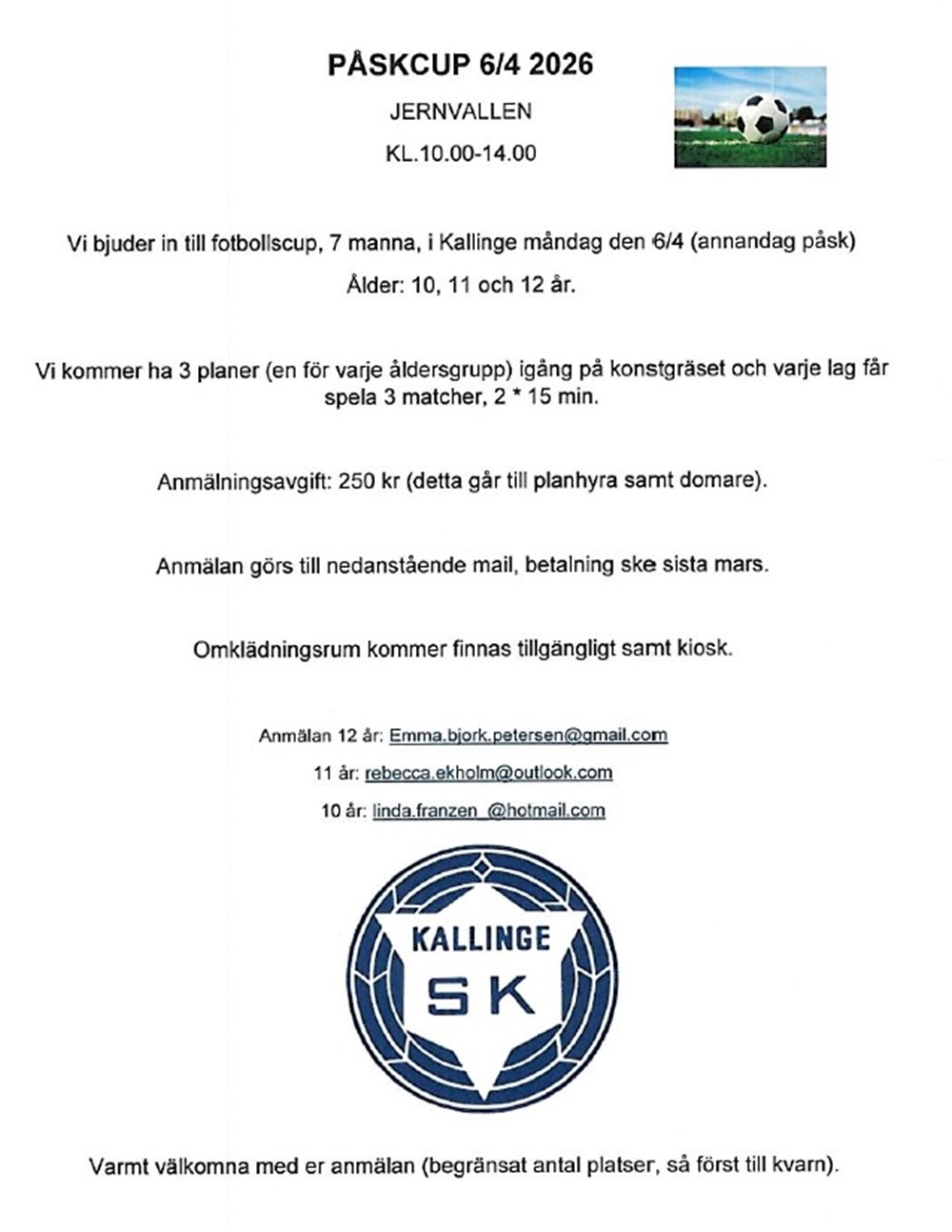 Kallinge SK önskar redan nu alla deltagande lag varmt välkomna!