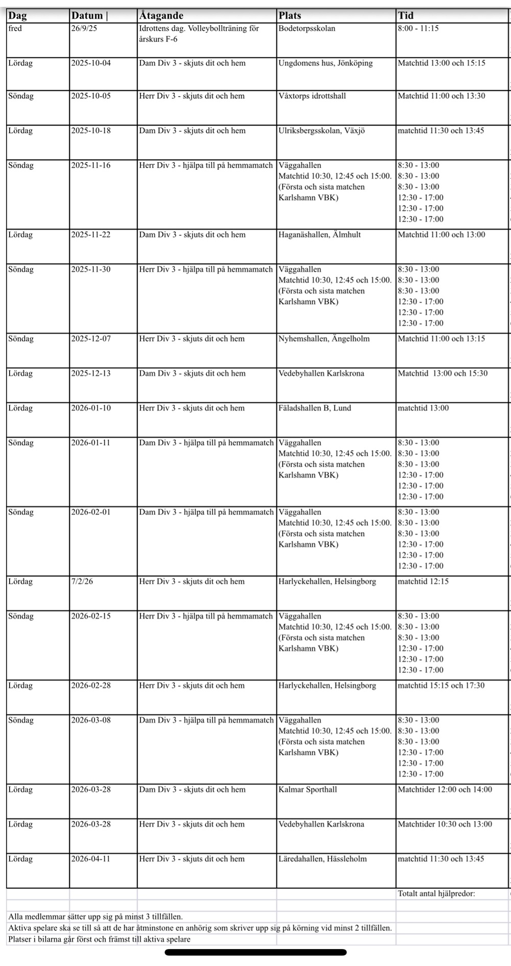 Schema för hjälp & körning till matcher