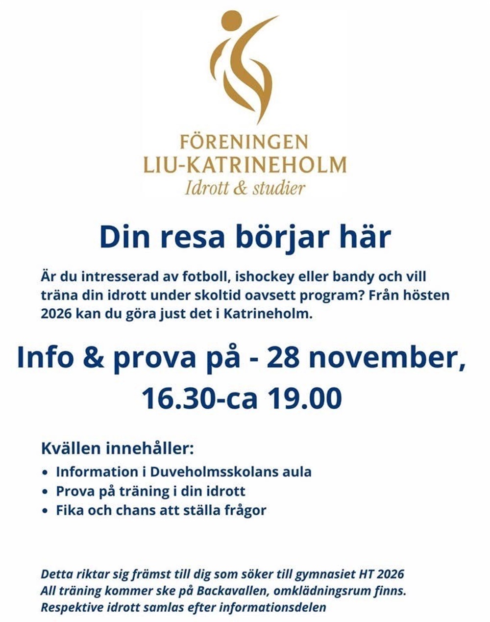 Efter en gemensam information kl 16.30 i Duveholmsskolans aula tar vi oss till ishallen för ytterligare information och rundvandring.