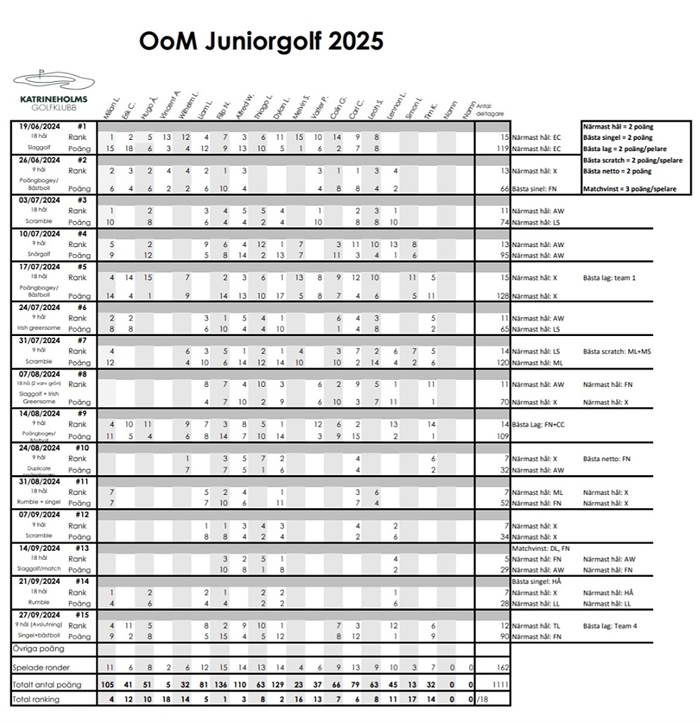 Då är finalen av juniorgolfen 2025 spelad! Det var jämt in i det sista men till sist vann Dylan på 25 poäng och bästa lag blev Team 4 med Filip, Colin, Tim och Carl på 31 poäng. Närmast hål var Thiago på hål 22 och Filip på hål 25. Länk till tävlingens resultat hittar ni här.