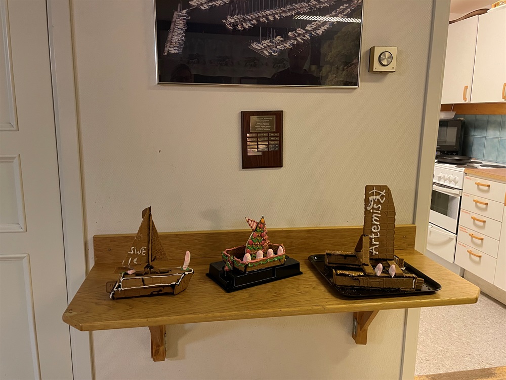 Vid årets traditionsenliga julmys med jolle byggdes de här tre snygga pepparkaksbåtarna! Som grund fick varje lag en hus-sats, dekoration, sågblad och smält socker som lim. Vi funderade på att sjösätta men det var lite för mörkt och regnigt ute… Tack till er som var med och till Julia och Oskar som fixade!