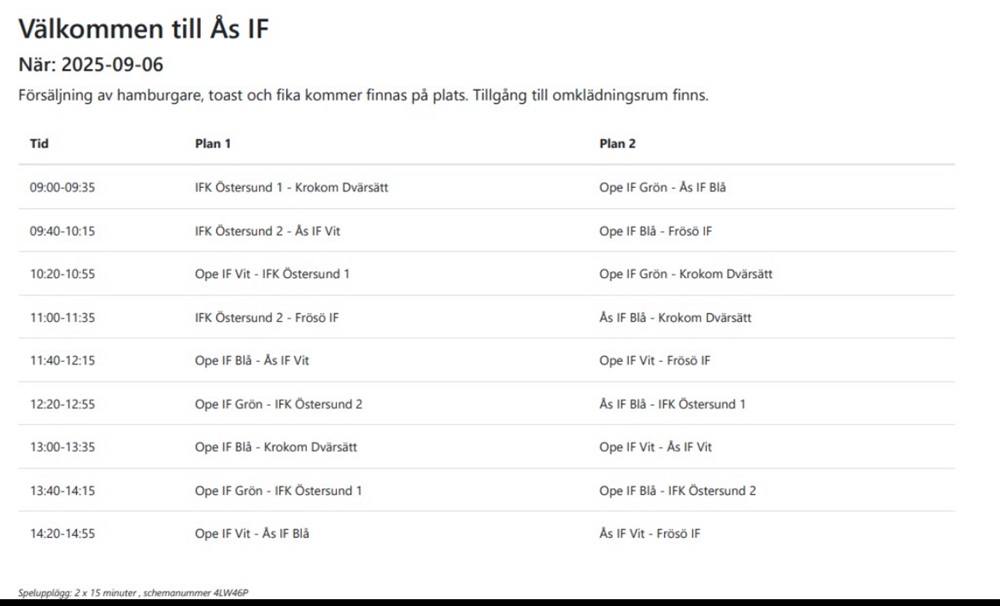 Matcherna är 2x15 minuter och vi kommer spela totalt fyra matcher. Vår sista match är slut kl. 13:35. Hela spelschemat finns i bifogad bild.