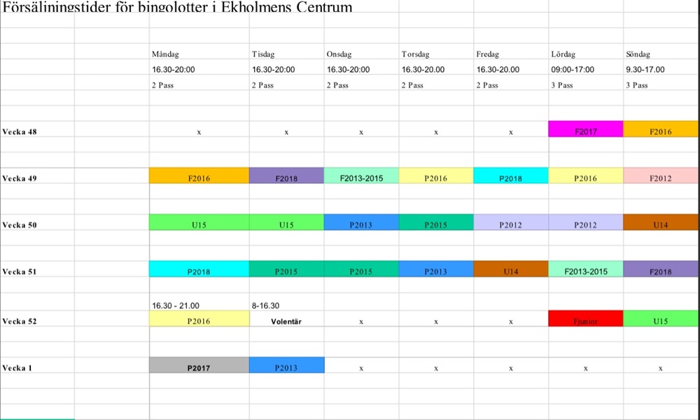 Jag har försökt strukturera upp detta så att vi tar varsitt pass enligt den laglista som finns på hemsidan. Vi har alltså tilldelats passen Tisdag 2/12 v.49 samt Söndag 21/12 v.51 (se bild). Passen består av 2 "barn"/tillfälle där varje "barn" har strax under 2 timmar/pass (varierar något) att sälja Bingolotter, Kalendrar osv. Har ni inte möjlighet specifik tid, så ansvarar ni själv för att byta tid med någon annan.