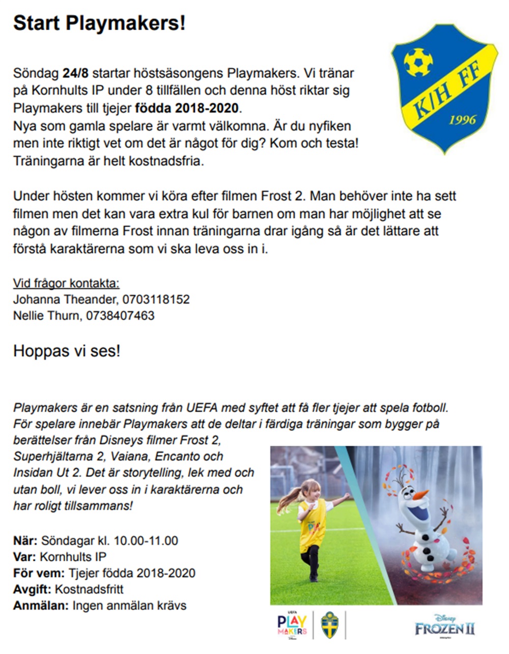 Är du tjej och född mellan 2018-2020? Välkommen att prova ett nytt koncept med UFEA:s och Disney´s Playmakers.