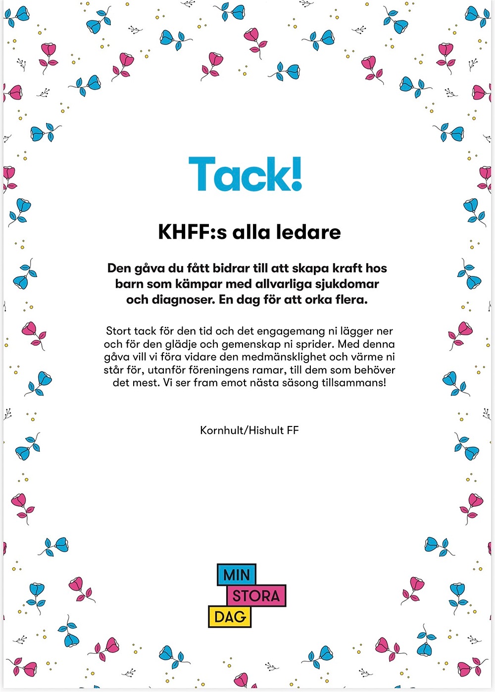 Sedan några år har vi valt att, istället för en blomma som vissnar och försvinner, visa vår uppskattning genom att skänka en gåva till Min stora dag. Denna organisation skapar ljusglimtar för svårt sjuka barn och detta är vårt sätt att hedra er insats. Genom att sprida den glädje ni ger våra barn vidare till andra som behöver den som mest, vill vi spegla den omtanke och värme som ni står för.
