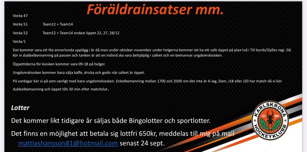 Rutiner för verksamheten i NKT Arena Karlskrona vid match i HOCKEYETTAN