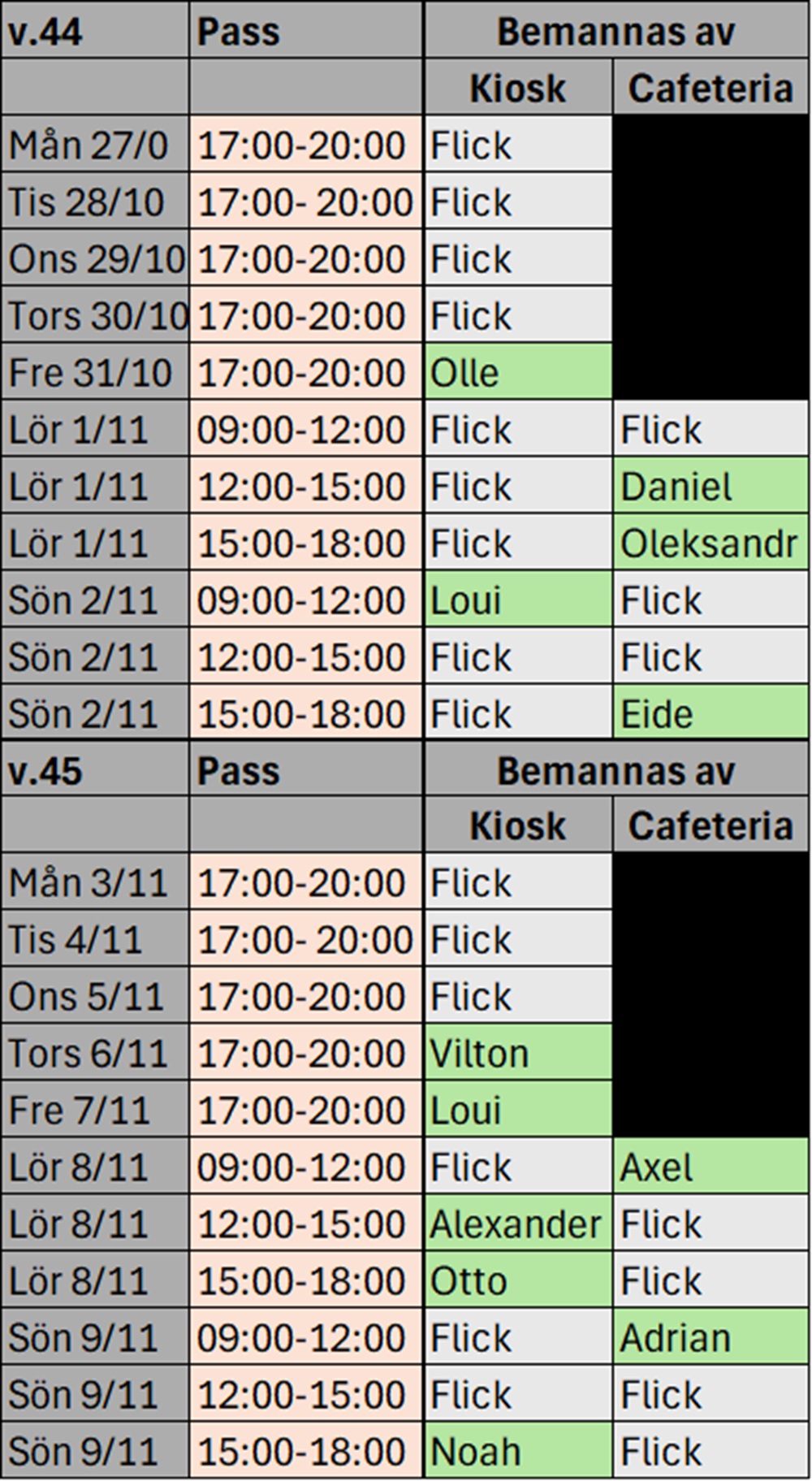 Ni får kallelserna till v.44 och v.45 redan nu. Var och en ansvarar själva för eventuella byten av tid. Ni finner kontaktauppgifter på svenskalag under kontakter (appen).