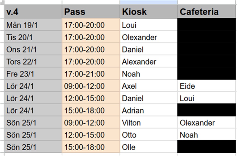 Jag publicerar schemat här, men kommer även skicka ut kallelser till var och en. Ni som är bemannad på cafeterian får kallelse under morgon dagen OM vi ska bemanna den.