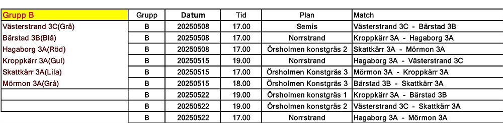 Första matchen spelar vi torsdagen den 8 maj kl 17:00 på Semis (planen vid sjukhuset vid discgolfbanan). Jag bifogar schemat som en bild i denna nyhet. Det är som vanligt tre matcher plus avslutning på våren och tre matcher på hösten. Jag har inte fått schema för avslutningen än så den infon kommer längre fram. Jag kommer skicka ut kallelser till matcherna via denna svenskalag, vore toppen om ni kunde svara på om ert barn kommer eller inte.