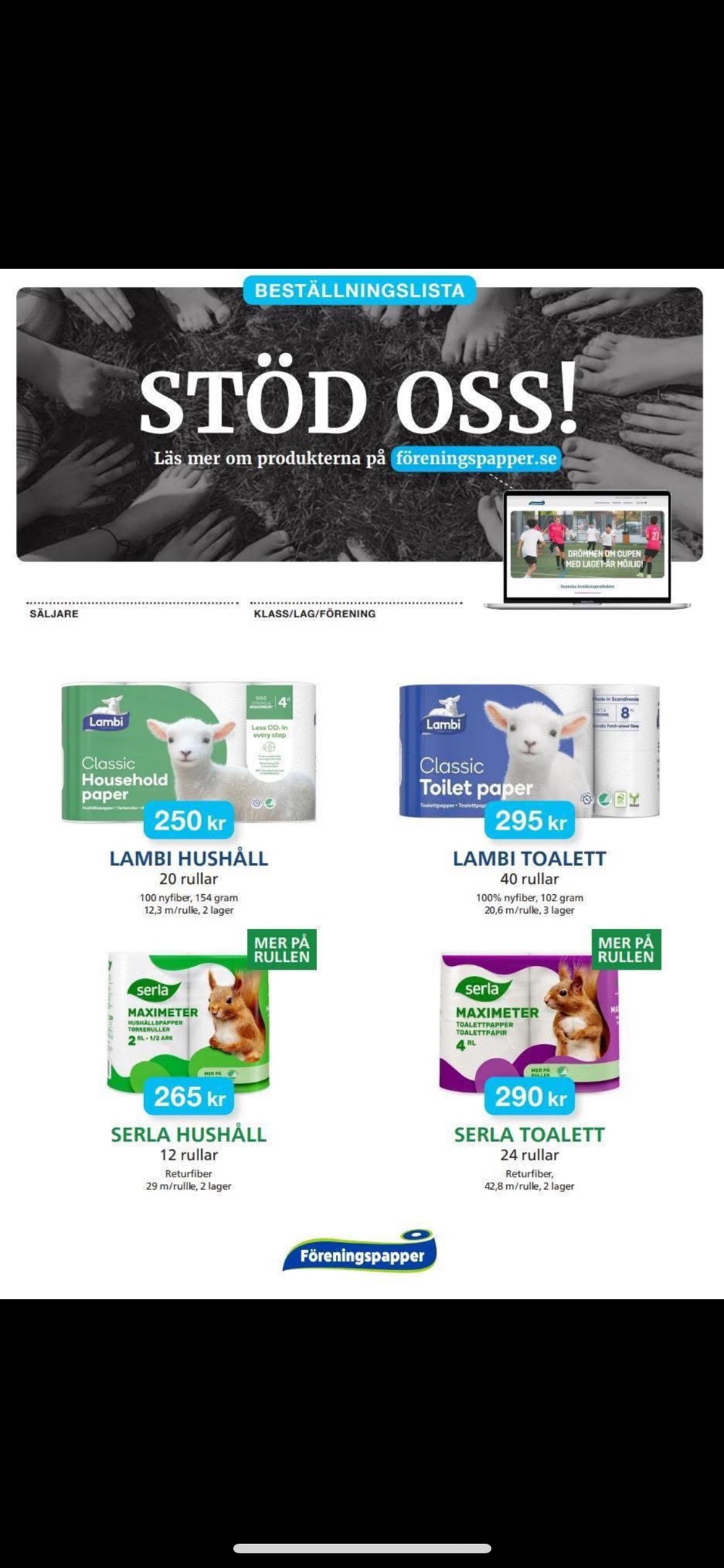Då var det dags att sälja toalettpapper. Vi ska sälja 10 st per hushåll så kommentera nedan om ni säljer för ett annat lag i föreningen. Smsa en sammanställning till mig Cicci 073-0345608 senast 3 februari. Man kan också välja friköp för 1000:-.