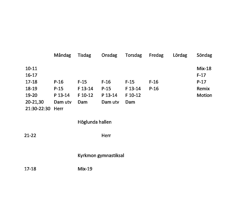 Om ni inte är nöjda med den tilldelade tiden får ni gärna komma överens med andra lag om ett byte. Viktigt är då att ni meddelar hallansvarig om ändringen, så vi har koll på vilka lag som tränar när.