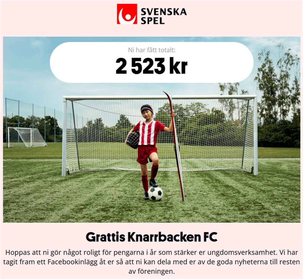 Tack alla som valt Knarrbacken FC till er gräsrotsförening på Svenska spel. För 2025 får KFC 2523kr.
