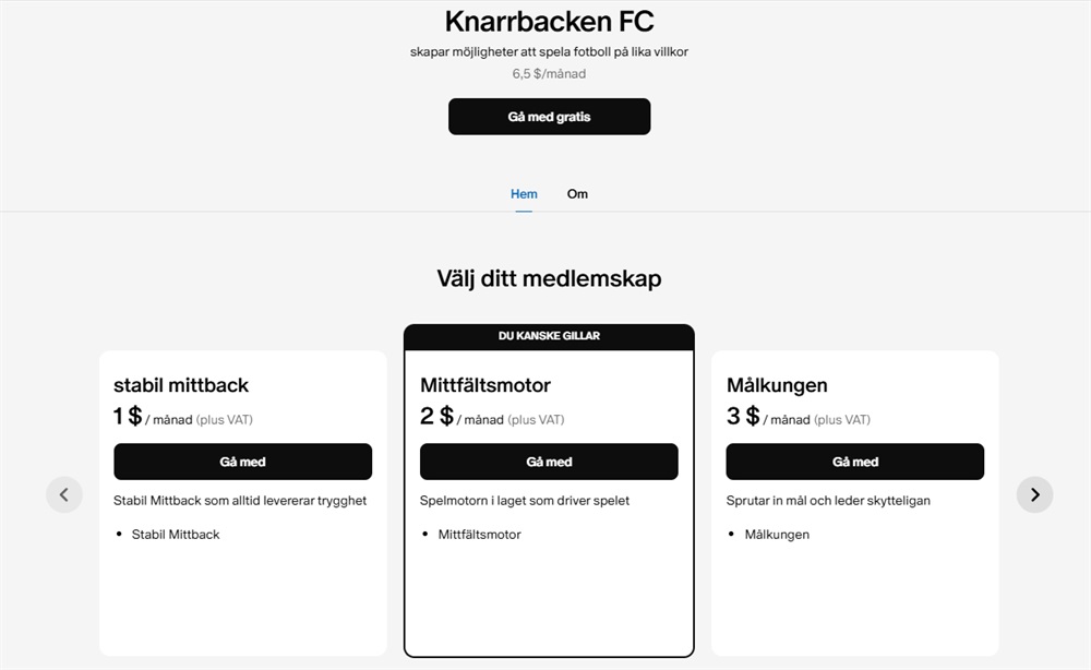 Ni kan stödja Knarrbacken FC varje månad genom att ansluta er till vår Patreon. Ni skapar ett inlogg gratis och sen väljer ni att stödja Knarrbacken FC samt vilket medlemskap som passar dig bäst.