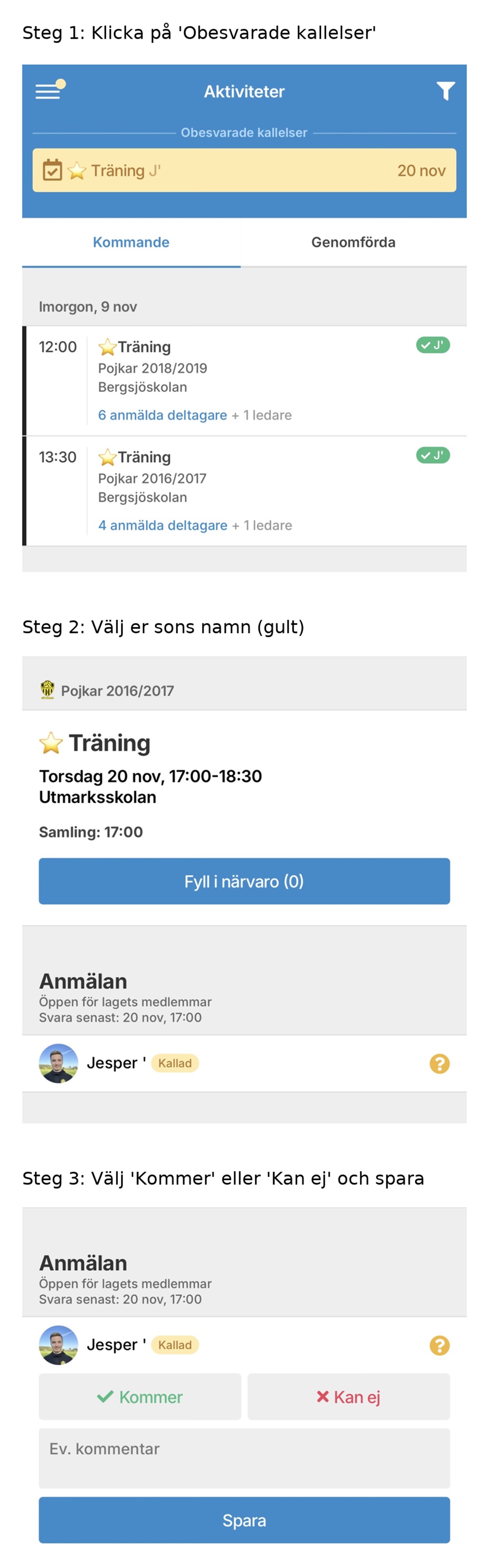 Vi vill påminna om hur viktigt det är att ni svarar på kallelsen inför träningarna, oavsett om er son kan komma eller inte. För oss ledare är det mycket lättare att planera bra och meningsfulla träningspass när vi vet hur många som kommer.