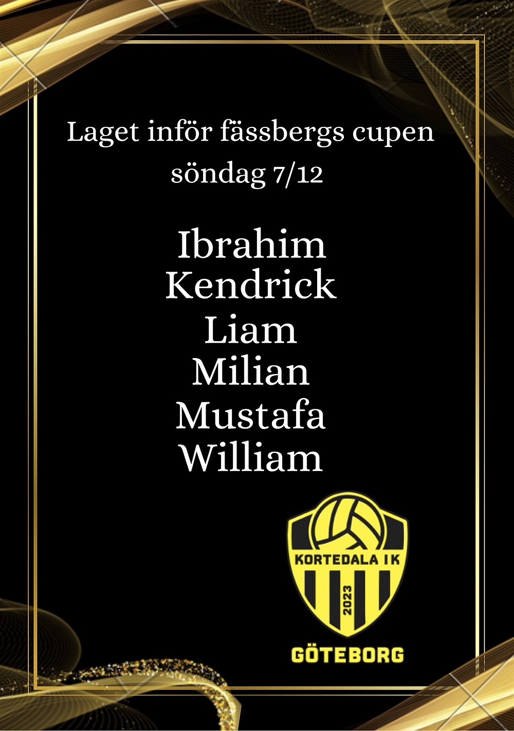 Benskydd( obligatoriskt) svarta shorts o svarta strumpor. Vi fixar matchtröjorna.