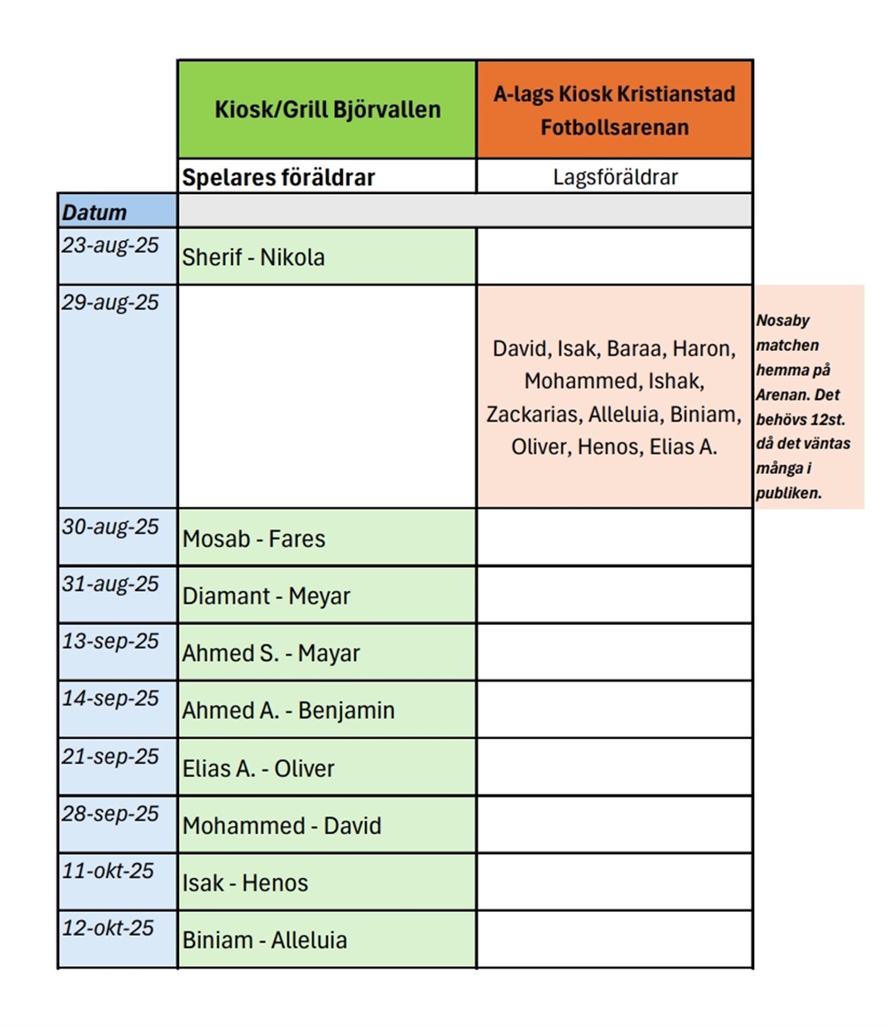 Det här hittar ni det nya schemat för samarbete kring kiosken/grillen och matcherna med A- laget. Det är väldigt viktigt att vi får ert stöd så att allt fungerar smidigt. Om ni inte kan delta under ert tilldelade pass, vänligen meddela oss i god tid så att vi kan göra ändringar.