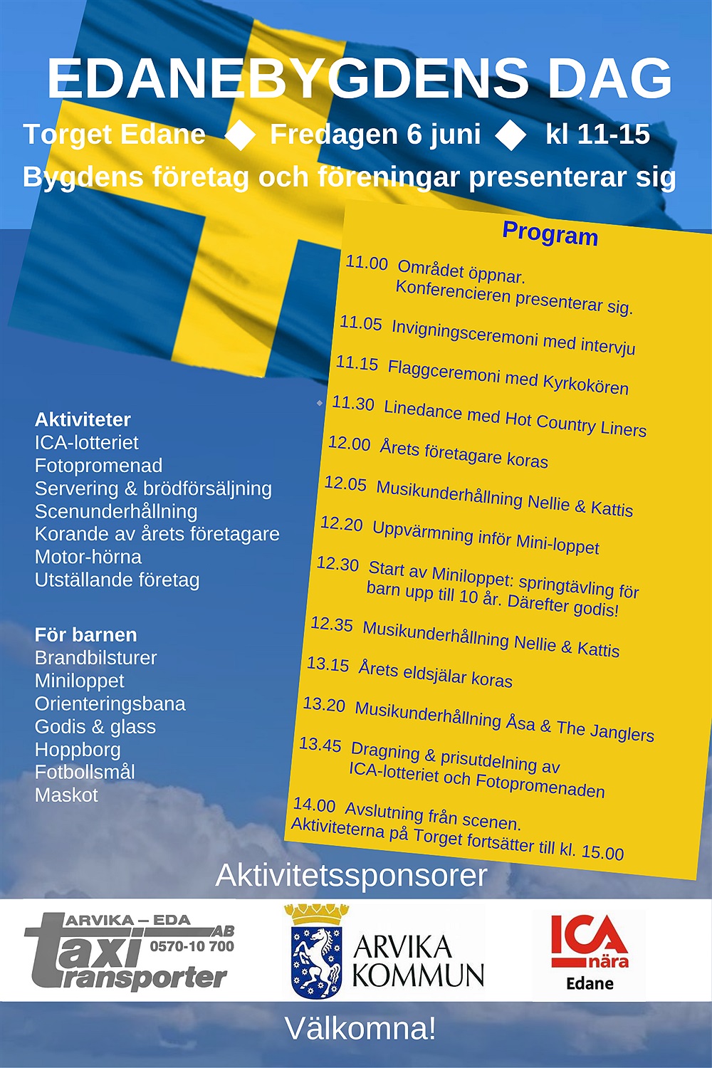 Välkomna alla till trivseldagen Edanebygdens Dag fredag 6/6 kl. 11-15 på Torget (utanför ICA) i Edane.
