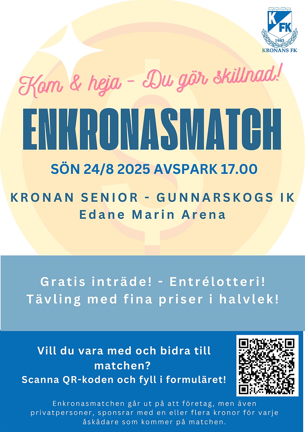 Därför bjuder vi söndag 24/8 in till en match med fri entré den när Kronan Senior tar emot Gunnarskog med avspark 17.00 på Edane Marin Arena som en "Enkronasmatch".