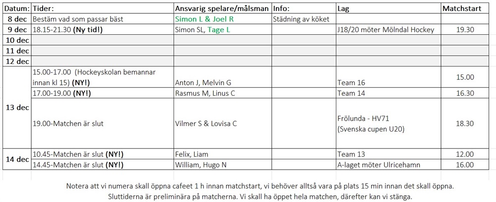 Nu är matcherna inlagda för vecka 50 och här ser ni ett uppdaterat förslag på bemanning. De namn som är gröna är de som har bekräftat att de kan.