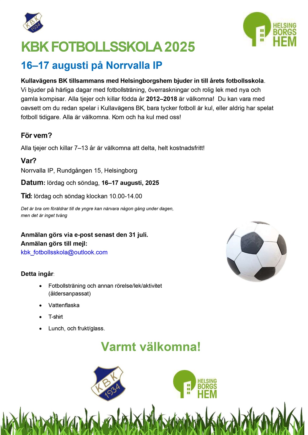 Årets fotbollsskola (2025) var den 16-17 augusti, så den är redan genomförd. Information om fotbollsskolan 2026 kommer här när datum är spikat. E-post: kbk_fotbollsskola@outlook.com
