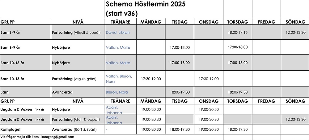 Påminnelse till alla medlemmar, de vanliga schemat (vårterminens) startar V. 34! Vilket betyder att de vanliga dagarna och tiderna gäller, exakt likadant som i våras.