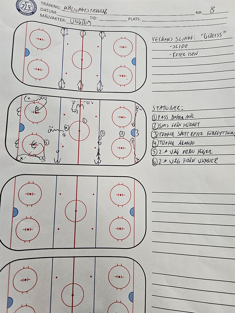 Vi började passet med Veckans Slinga innan vi delade upp träningen i 6 stationer. Två av stationerna handlade om scanning, två om trafik och två om närspel. Hela passet finns på bilden ovan.