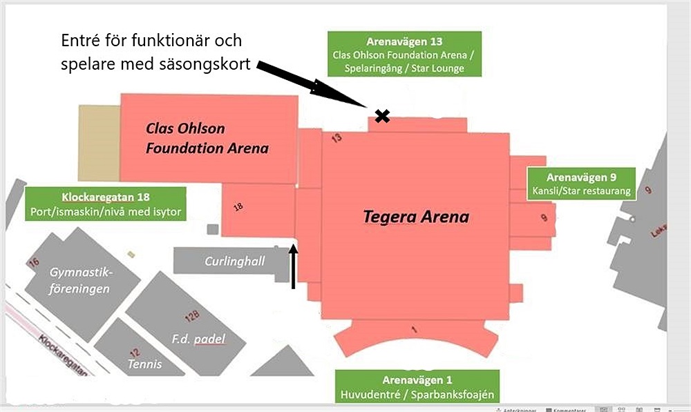 Det här medför tyvärr att vi inte kan ha funktionärs och spelarentrén vid nödutgångarna bakom Puck Munthe utan måste flytta funktionärsentrén till en dörr med kortläsare.