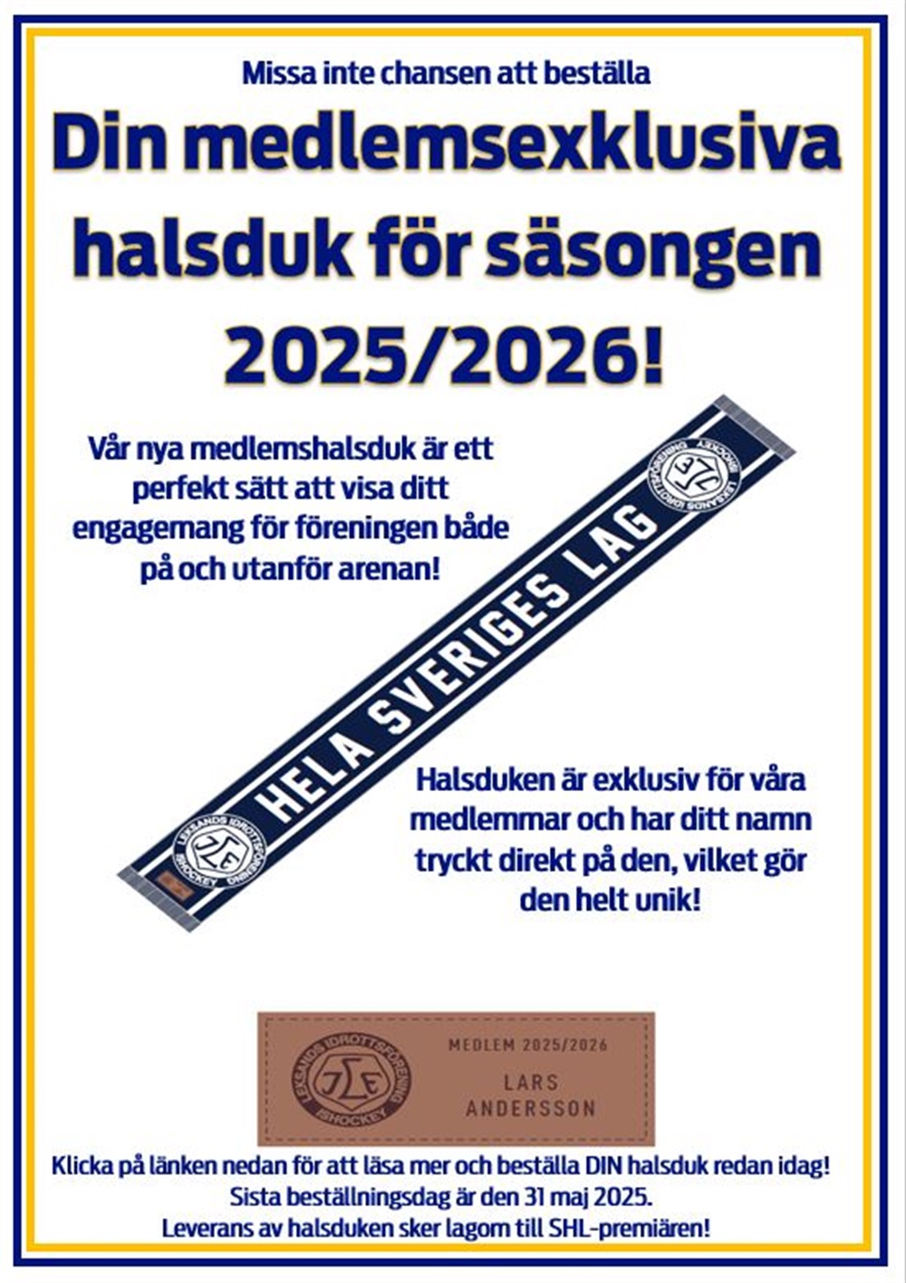 Nu på lördag den 31 maj är det sista dagen för att kunna beställa din medlemsexklusiva halsduk för säsongen 2025/2026 och samtidigt visa vilket som är laget i ditt hjärta!