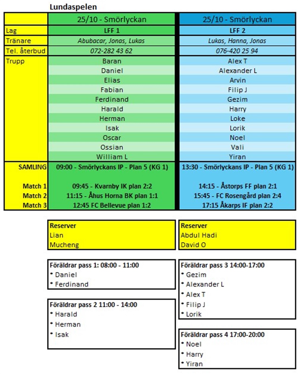Vi har fått ihop hela 13 föräldrar som hjälper till. Vi hoppas att alla är utsatta på rimliga platser i schemat. Varje grupp tänker jag samlas vid klubbstugan och kommer överens med varandra om vem som gör vad. Det kommer inte bara vara ni som jobbar i kiosken utan även föräldrar från P2016 samt förhoppningsvis även lite ungdomsspelare och dylikt.