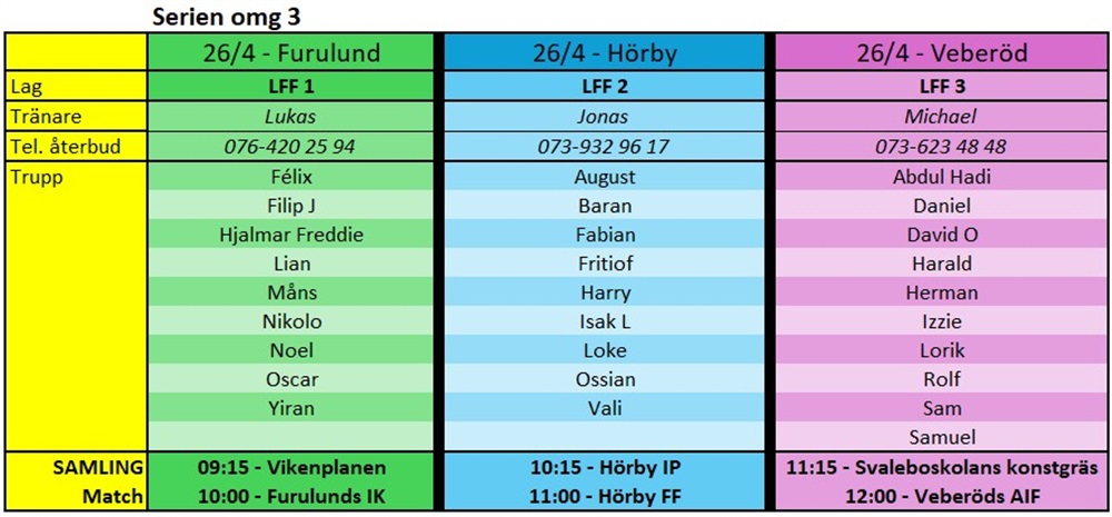 Här är trupperna till söndagens tre matcher. Ett riktigt styrkebesked av oss att kunna mönstra trupper i tre bortamatcher åt olika håll med så kort tid mellan :)