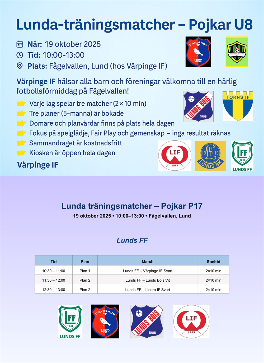 Här kommer info om söndagens träningsmatcher på Fågelvallen, ordnade av Värpinge IF. Vi kommer att spela tre matcher om 2x10 minuter mot olika Lundalag (se bild). Vi samlas klockan 9.30 på Fågelvallen. Klockan 9.45 samlas alla lag som ska vara med ute på planen för att presentera sig och hälsa på varandra, så att vi vet vilka vi kommer att möta under dagen. Därefter värmer vi upp inför vår första match, som börjar 10.30.