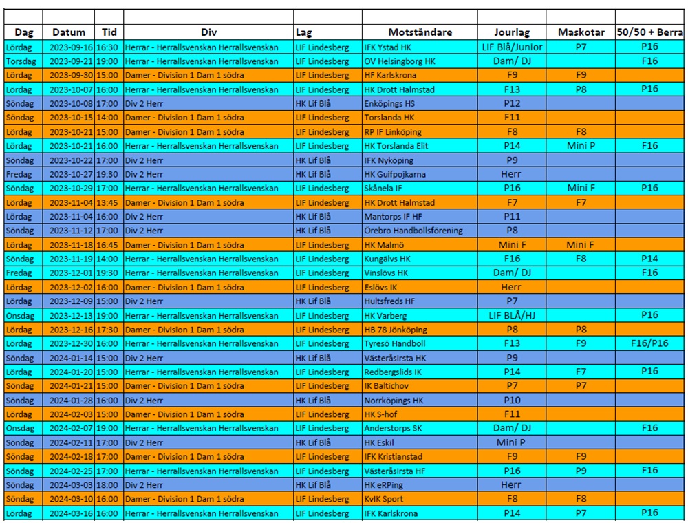 Tjejerna kommer ha jourlag och vara maskotar på en del matcher, Excelbilden visar ett preliminärt schema. Vi återkommer om det blir några förändringar. Vi kommer försöka ordna med kallelse till de tillfällen som är, så vi kan ha lite koll på hur många som kan närvara varje tillfälle. Ladda därför ner appen SvenskaLag så ni kan se både kallelser, träningar och information på ett smidigt sätt.