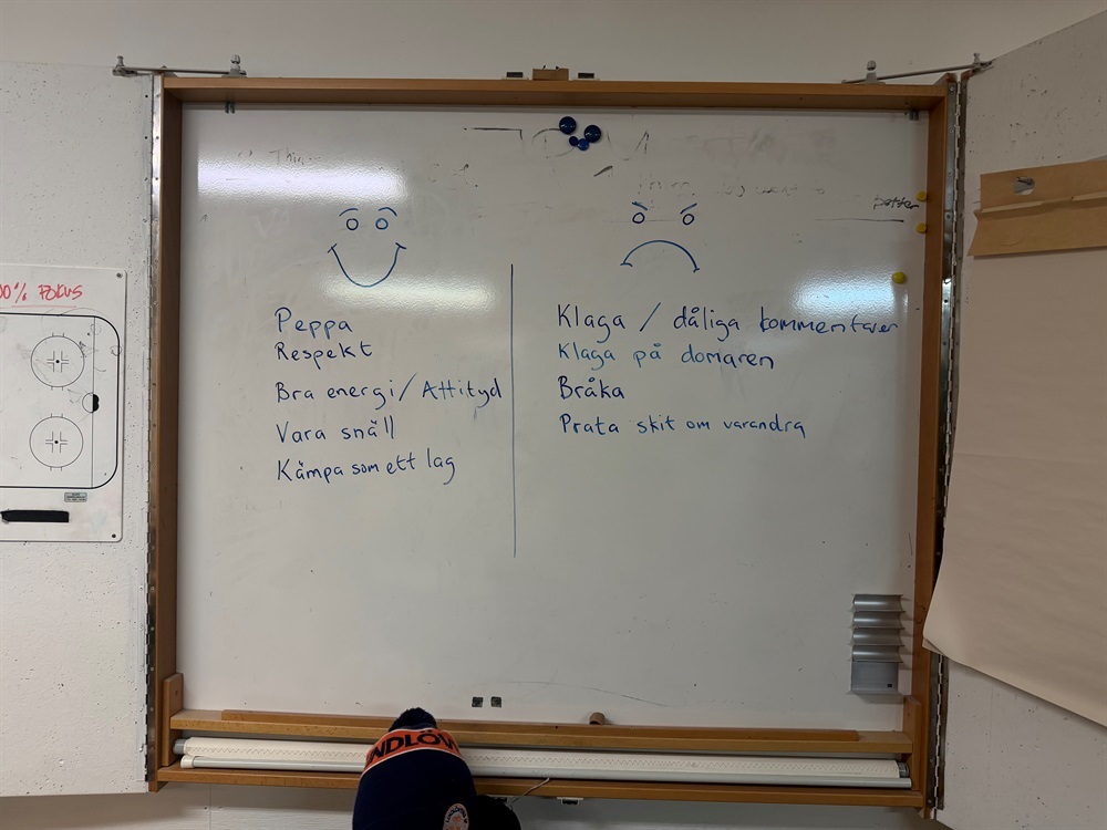 Efter det arbetade spelarna i mindre grupper. Till vår glädje fångade samtliga grupper upp mycket av det positiva som redan finns i laget, men de lyfte också fram beteenden och saker som vi gemensamt är överens om att vi inte vill ha i vår grupp. Vi skickar med denna information till er så att ni gärna får hjälpa till att påminna och förstärka detta även hemma.