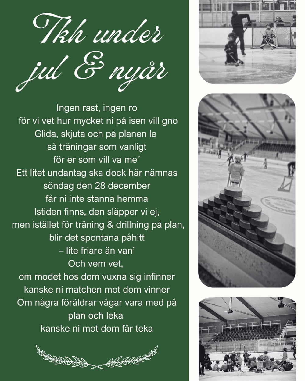 Vi kör på med träningar som vanligt söndagar kl 09.00 under hela jul och nyår. Med ett undantag för söndagen 28 december - då får ni ta med syskon, föräldrar eller kanske en mormor eller farfar ut på isen. Då leker vi, spelar match och umgås tillsammans för dom som kan och vill.