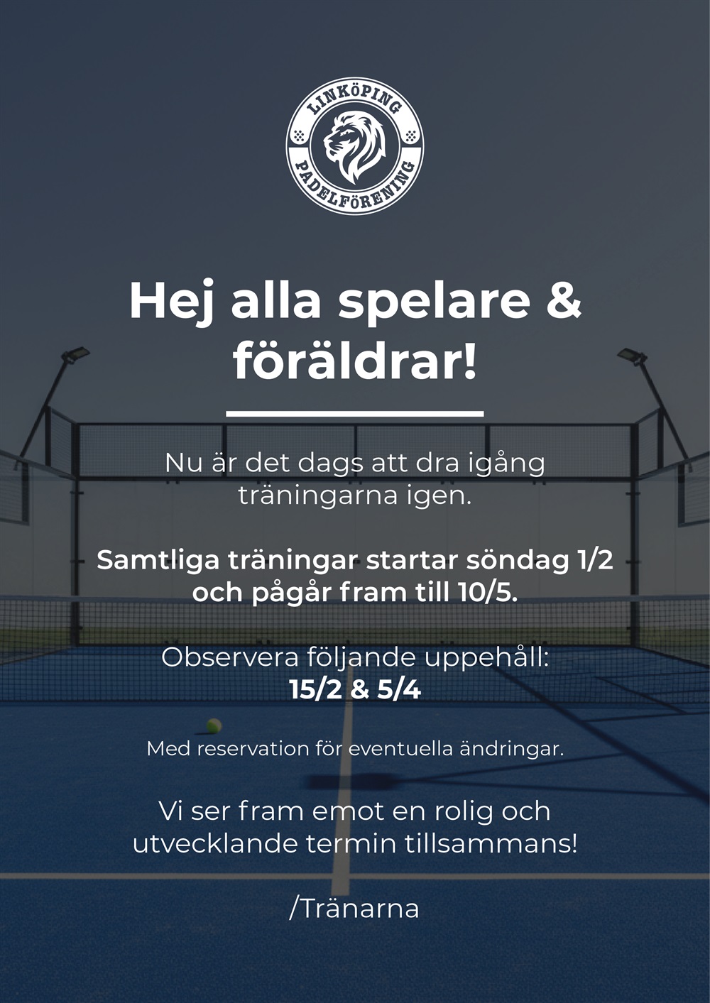 Samtliga träningar startar söndag 1/2 och pågår till 10/5.