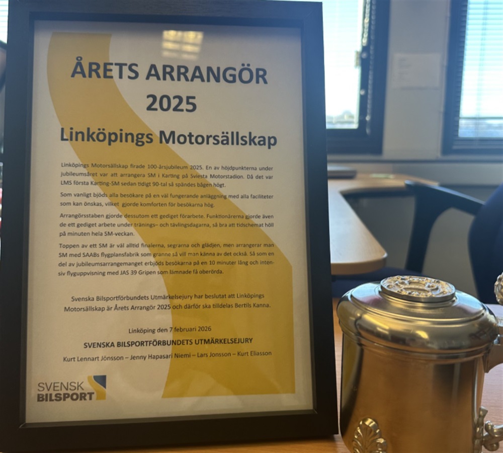 Svenska Bilsportförbundet har utsett Linköpings Motorsällskap till Årets Arrangör 2025. Denna utmärkelse får föreningen för arrangemanget av kart-SM, bra jobbat av kartsektionen.