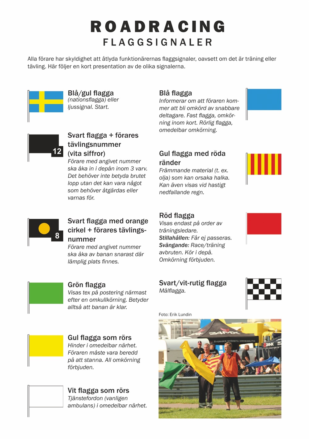 Flaggsignaler Roardracing: Alla förare har skyldighet att åtlyda funktionärernas flaggsignaler, oavsett om det är träning eller tävling.