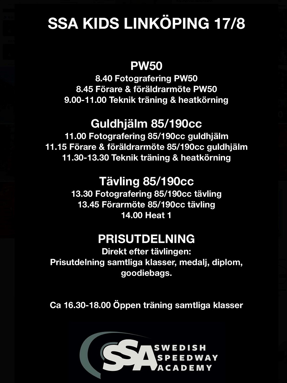 Kom och se framtidens stjärnor inom speedway! Nu på söndag den 17 augusti bjuder vi in till en helspäckad dag med ca 40 st av våra unga talanger på banan! Det blir fart, spänning och massor av fantastisk körning. På programmet: PW-50 träning: 09:00–11:00 Guldhjälm 85cc/190cc träning: 11:30–13:30 Heat 1 i den häftiga tävlingen för Guldhjälm 85cc/190cc: start 14:00 Prisutdelning direkt efter tävlingen Fri träning för alla klasser: 16:30–18:00 Kom och upplev en dag fylld av motorsportglädje och heja fram nästa generation speedwayförare! Filbyterna Speedway Söndag 17 augusti Start 09:00 Vid frågor kontakta ansvarig Peter på filbyterna@gmail.com