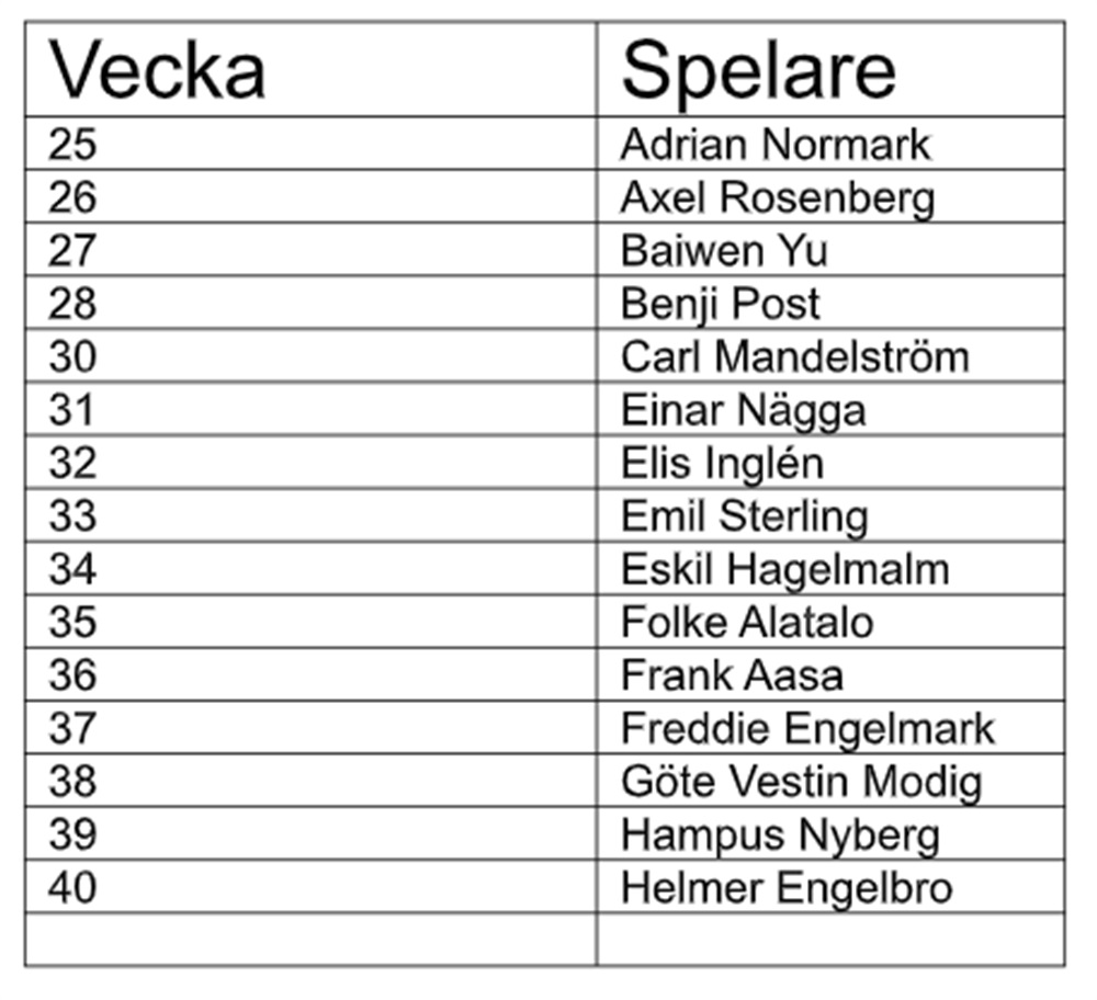 Vi i föräldragruppen har därför satt ihop ett rullande pantschema för detta som sträcker sig fram till och med september. Eftersom det är fler spelare i laget än antal veckor för pantningen, har vi för enkelhetens skull bara följt spelarlistan och börjat uppifrån. Vi kommer sedan att fortsätta efter listan när andra uppdrag kommer, såsom bakning och fikaförsäljning vid sammandrag. Vi alla får hjälpas åt på olika sätt!