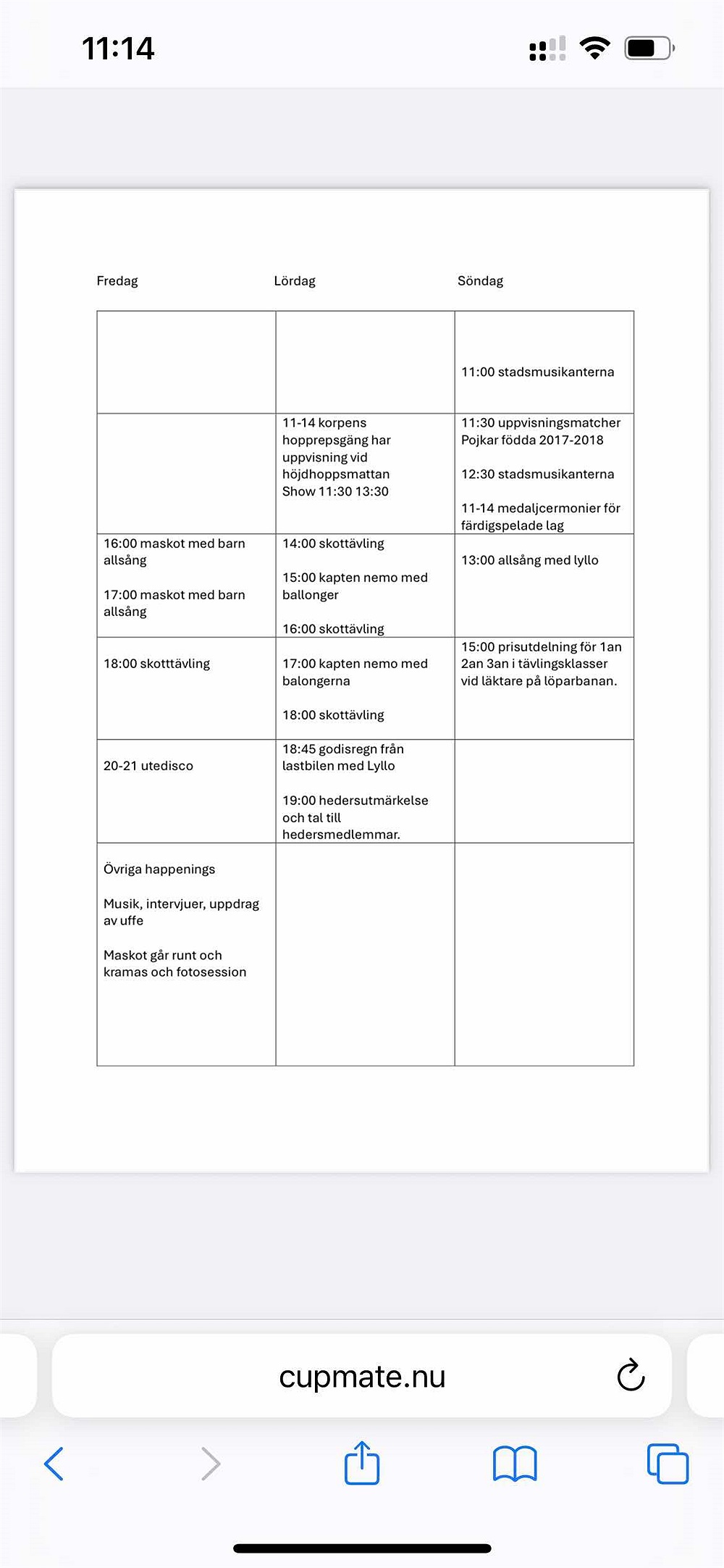 - Vi behöver vara i matsalen senast 11:00 imorgon för att undvika köer, se till att ni är i god tid på plats. Vi äter lunch först och ser till att packa upp allt eftersom. Men vissa lag har matcher rätt så tight efter lunch så se till att spelarna har sina matchkläder nära till hands (förutom t-shirt, sen får de på plats).