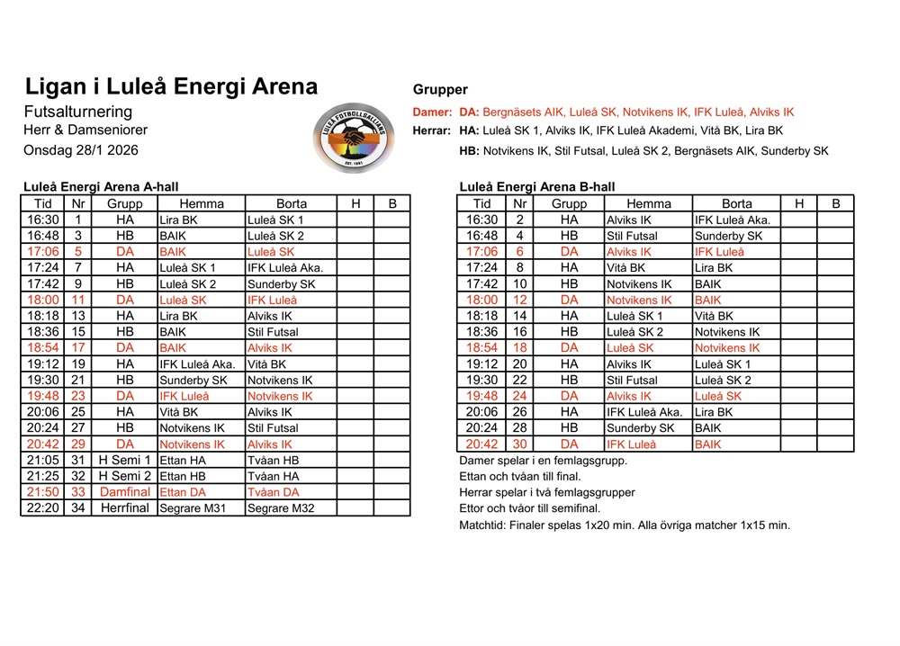Spelschema för futsalligan.HÅLL KOLL PÅ TIDERNA!