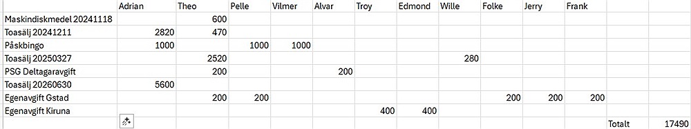 Beloppen betalas in på respektive QR-kod förutom Maskindiskmedel 20241118 och Toasälj 20241211 som swishas till mig på 0702005168. Glöm inte att svara på kallelsen när ni har betalat in.