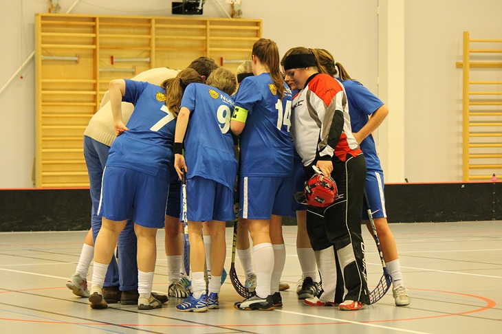 Inledningen av period två började på ett fantastiskt sätt. Vi vinner boll ganska snabbt efter teckningen och undertecknad får bollen ute på vänster kanten står och fifflar lite, börjar få panik "VART SKA JAG?!" hör en röst som ropar PASSA MIG! Och ja det var väl bäst och lyda order så, en pass fick det bli, och där kommer Lustig i full fart och skjuter in den rakt i mål! (Bild på hennes glädjereaktion finns att beskåda i bildarkivet). Vi orkar inte riktigt med att hålla vårt inledande tempo utan vi tappar och släpper in 3 snabba mål. Vi tar timeout, rycker faktiskt upp oss en aning. Sedan åker båda lagen på en utvisning, de i form av fasthållning och vi (Cissi) i form av hårt spel. Så spel 4 mot 4 något som de var en aningens bättre på än oss, vi är under denna period lite lätt förvirrade och de lyckas göra ytterligare 1 mål.