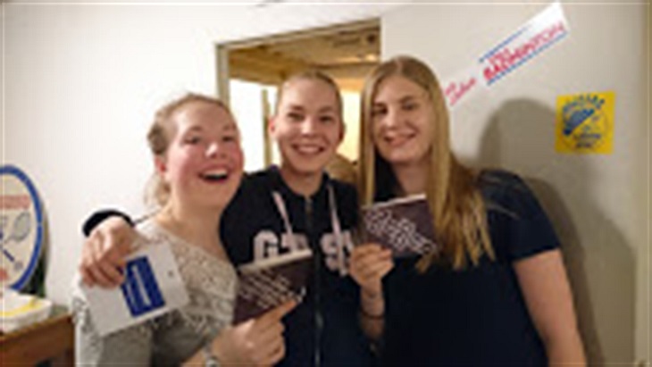 Tre lyckliga uppklassade damer. Stina och Emma till A-klass och Malin till Elit-klass